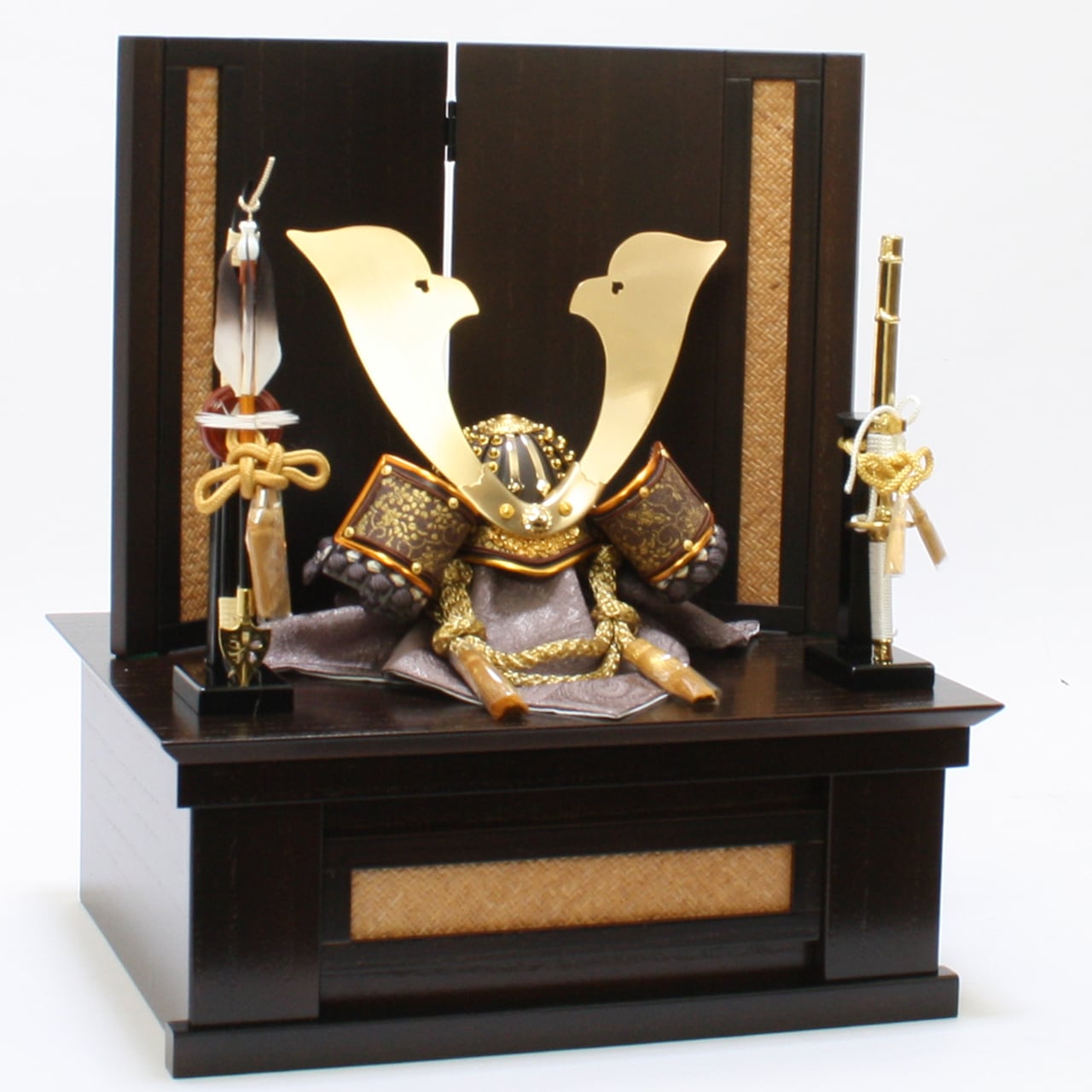 飾り台の中に兜、御道具を収納できるワンパッケージタイプ。飾り台と屏風の豪華な彫金が人気のシリーズです。