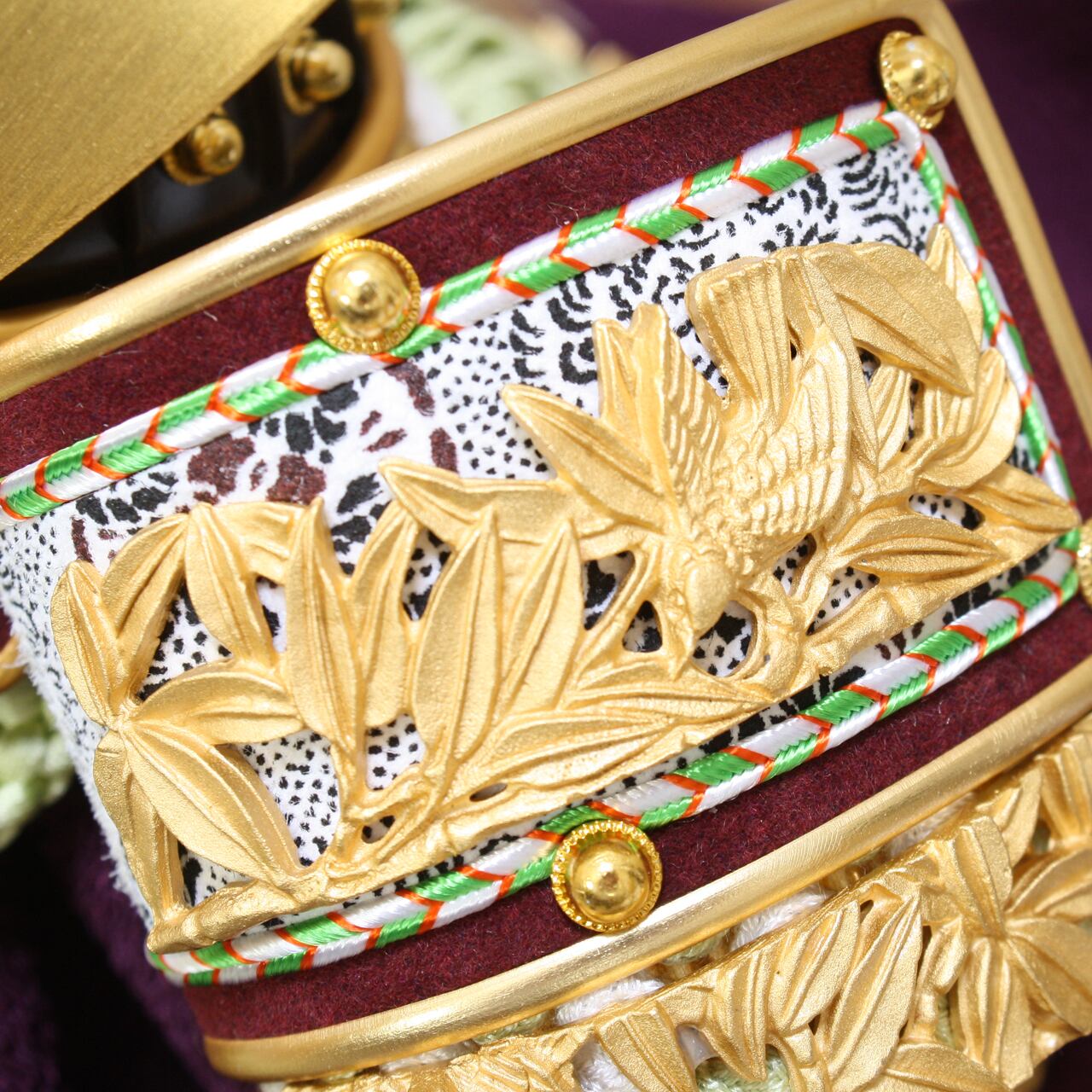 すべての飾り金具に純金鍍金(金メッキのこと)を施しています。金具の素材は鉛(なまり)とアンチモニーの合金です。それを磨いて、金メッキを施しています。