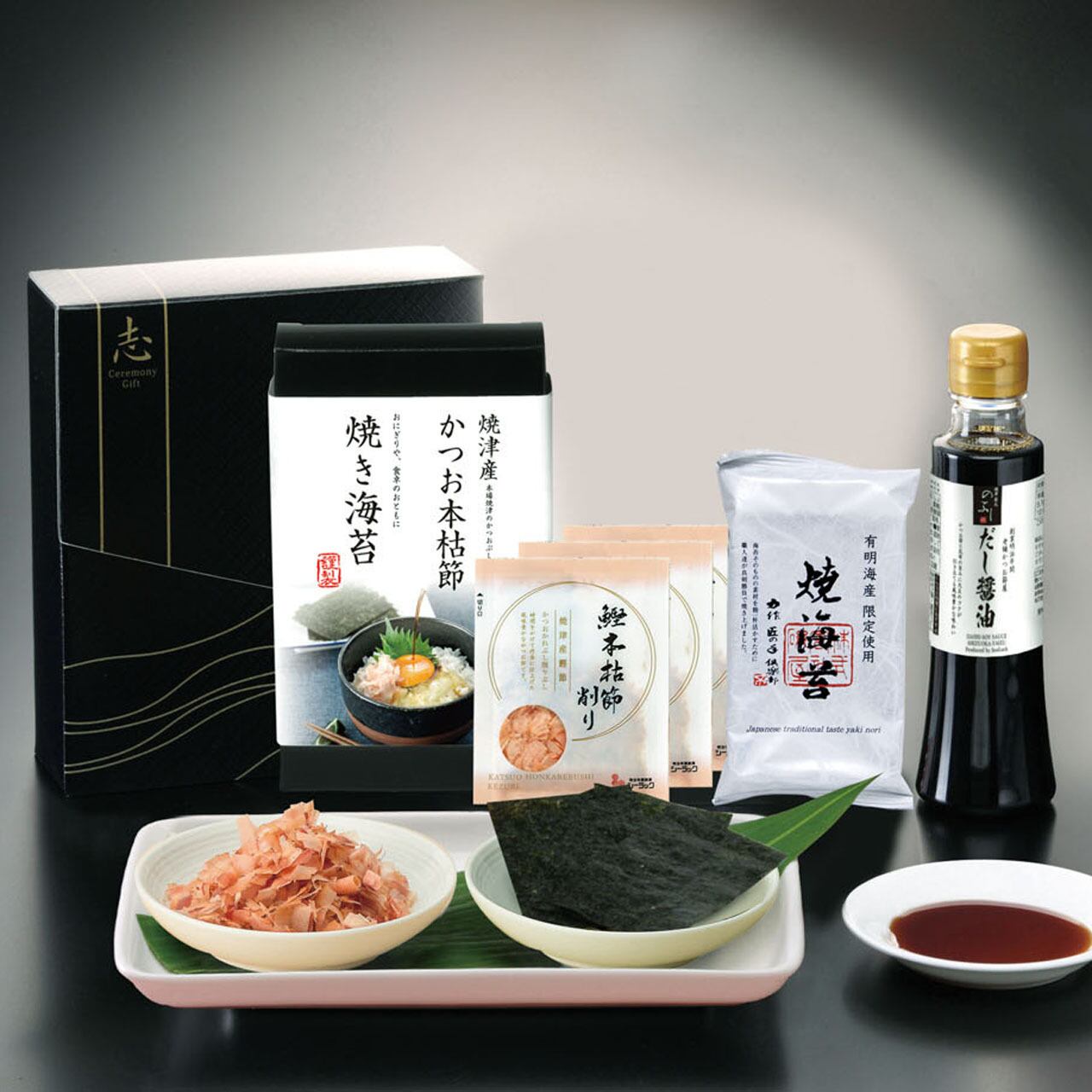 ◇かつお節屋のだし醤油200㎖×1本、焼津産かつお本枯節削り×3袋、焼海苔八つ切り6枚×1袋