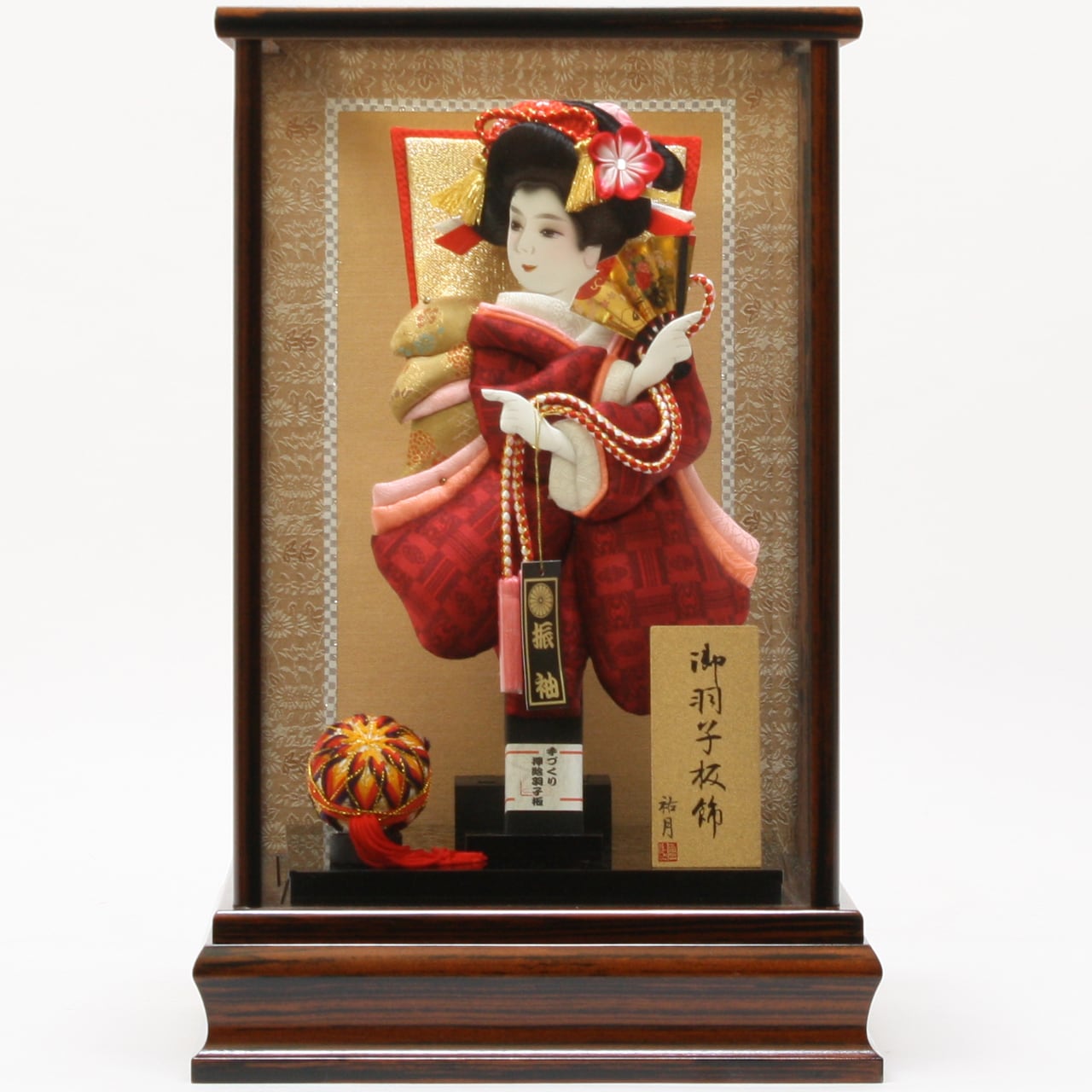 羽子板飾り《商品コード》10308-0157 花振袖 正絹博多織 献上キューブ 赤 10408-0800 羽子板ケース 古都 黒檀塗|初正月|省スペース|おしゃれ|モダン|コンパクト|江戸押絵羽子板|無病息災|邪気払い|無患子