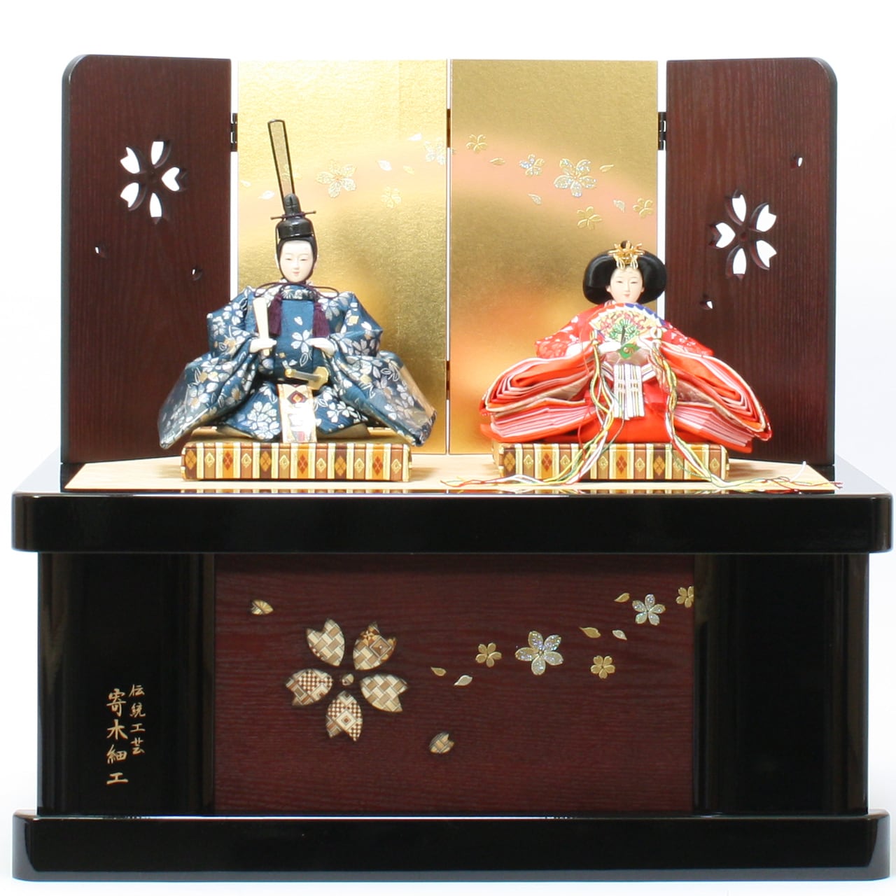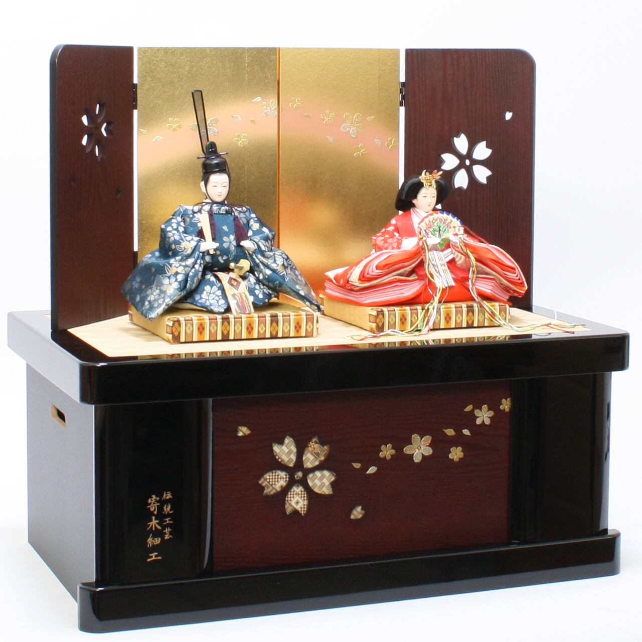 雛人形|ひな人形|初節句|コンパクト|おしゃれ|モダン|インテリア|プレミアム|こだわり|おすすめ|作家|収納〔商品コード〕32200-8007 〔品番〕MAT8007 京三五親王 Y7205-1 紺×赤 桜 〔商品コード〕33320-1912 〔品番〕3-19-12 台屛風セット 透かし桜60㎝ 黒塗収納
