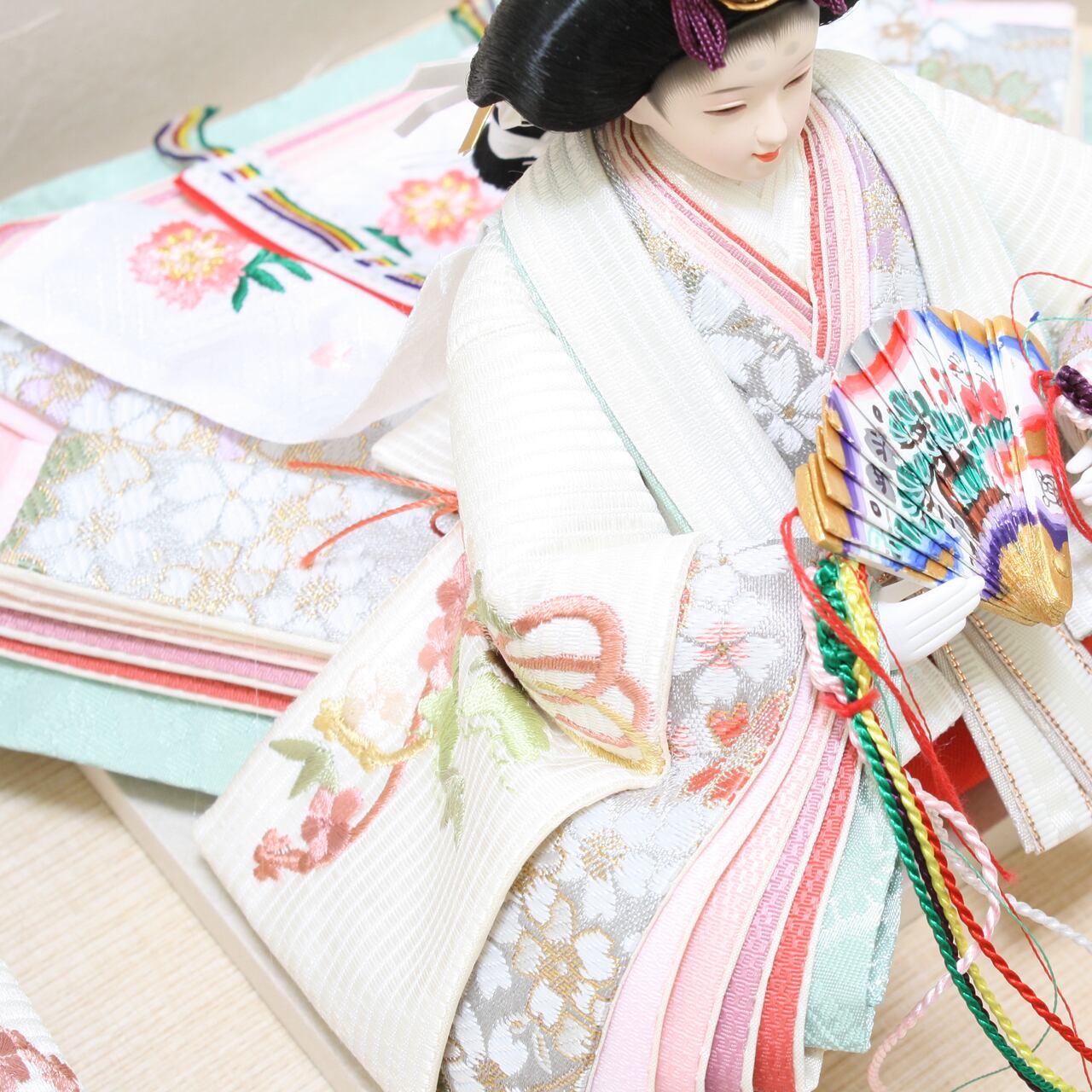 吉藤工房は、十二単の美しさにこだわりをもって雛人形づくりを行っています。正面から見たときはもちろん、横や後ろから見たときに衣装の美しさが際立つよう、0.5mm単位で縫製し、調整して制作しています。