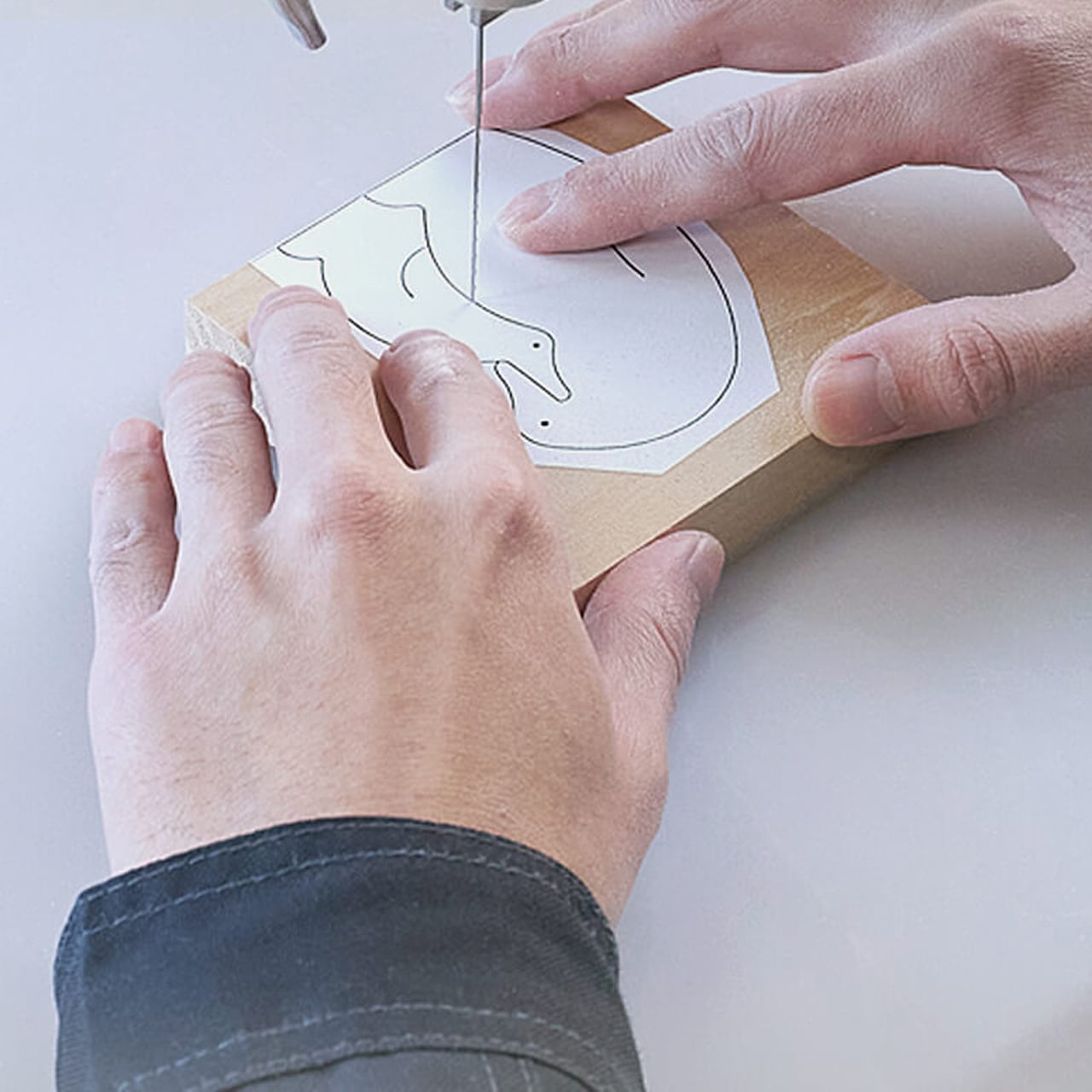 小黒三郎の組み木は、天然木から製材した一枚の板を、職人が電動糸鋸を使って手作業で切り抜いています。一枚の板から切り抜くので、組み合わせると木目がピタリとあうのが特徴です。