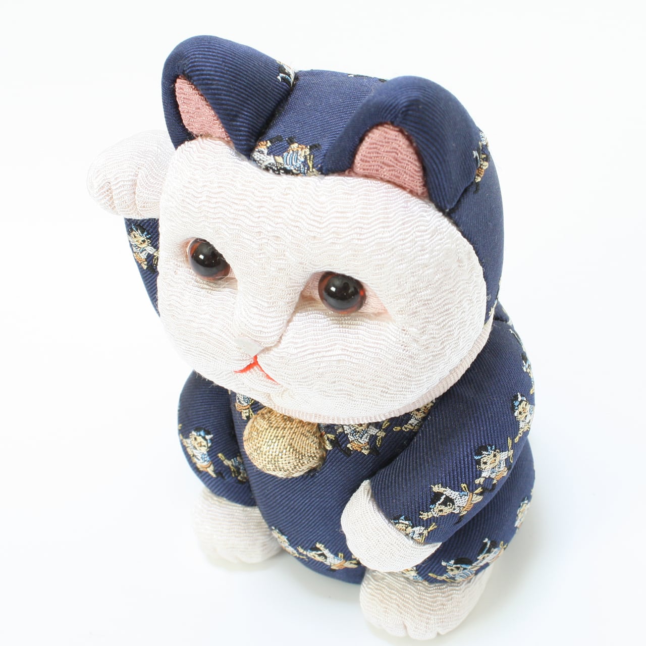 珍しい木目込み人形の招き猫です。「招き猫」は古来より、開運招福や千客万来、商売繁盛をもたらす縁起の良い置物として、多くの日本人に愛用されてきました。招き猫の目にスワロフスキー、鈴にパワーストーンをあしらい、胴体には博多の伝統工芸、博多織の正絹の生地を使用しています。製作は経済産業大臣認定の伝統工芸士「柿沼東光」作となっております。