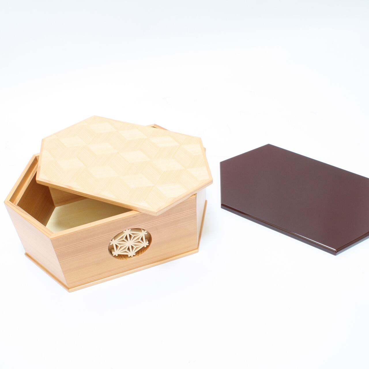 《麻の葉模様(収納箱中央):鹿沼組子細工(桧)》