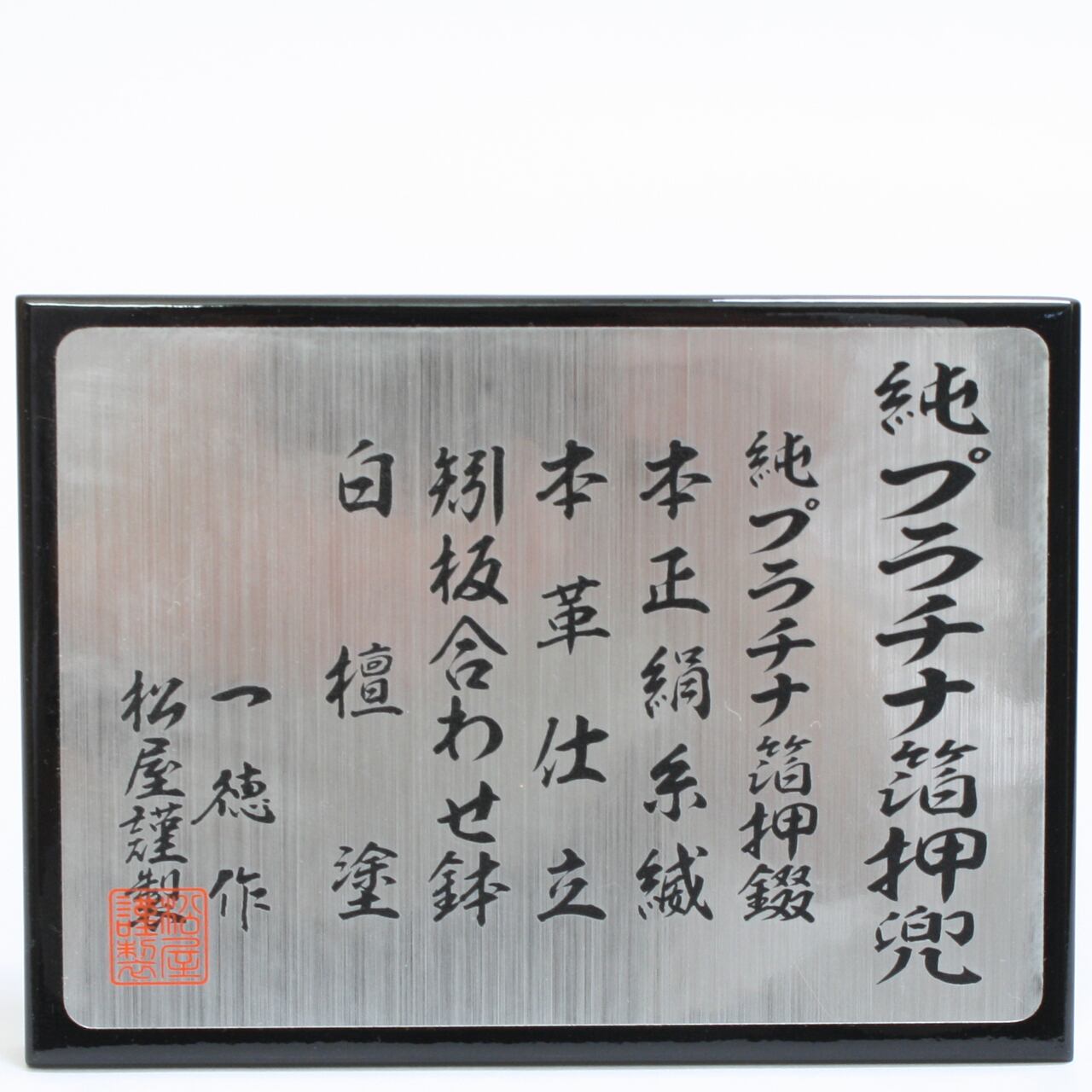 兜の鉢はプレスして型抜きしたものではなく、数十枚の金属板を加工し、手作業で鋲打ち留めをし、鉢を形成する矧ぎあわせ鉢にしました。鉢裏には本革を当て仕上げる加工をしております。威しに使用した小札(糸を通す板)はプラチナ箔を一枚一枚丁寧に押しながら貼る仕上げとなっております。いつまでも色あせない、プラチナ箔押しの輝きをご覧ください。また、木製の飾り台の中にすべて収納できる省スペース型収納タイプとなっております。