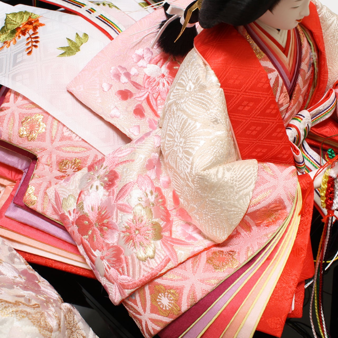 ご覧頂きたいのは女雛の裾縫いです。一般の雛人形は三枚仕立てで、上級の雛人形でさえも五~八枚はぎのみで仕立てられます。飛鳥雛は八枚矧ぎに加え、襲ね(かさね)の部分を、48枚もの型を使い、少しずつ寸法を変えて段々に大きく仕上げています。柔らかな姿態と襲ねの色彩効果で、十二単衣の持つ流麗な美しさを演出します。