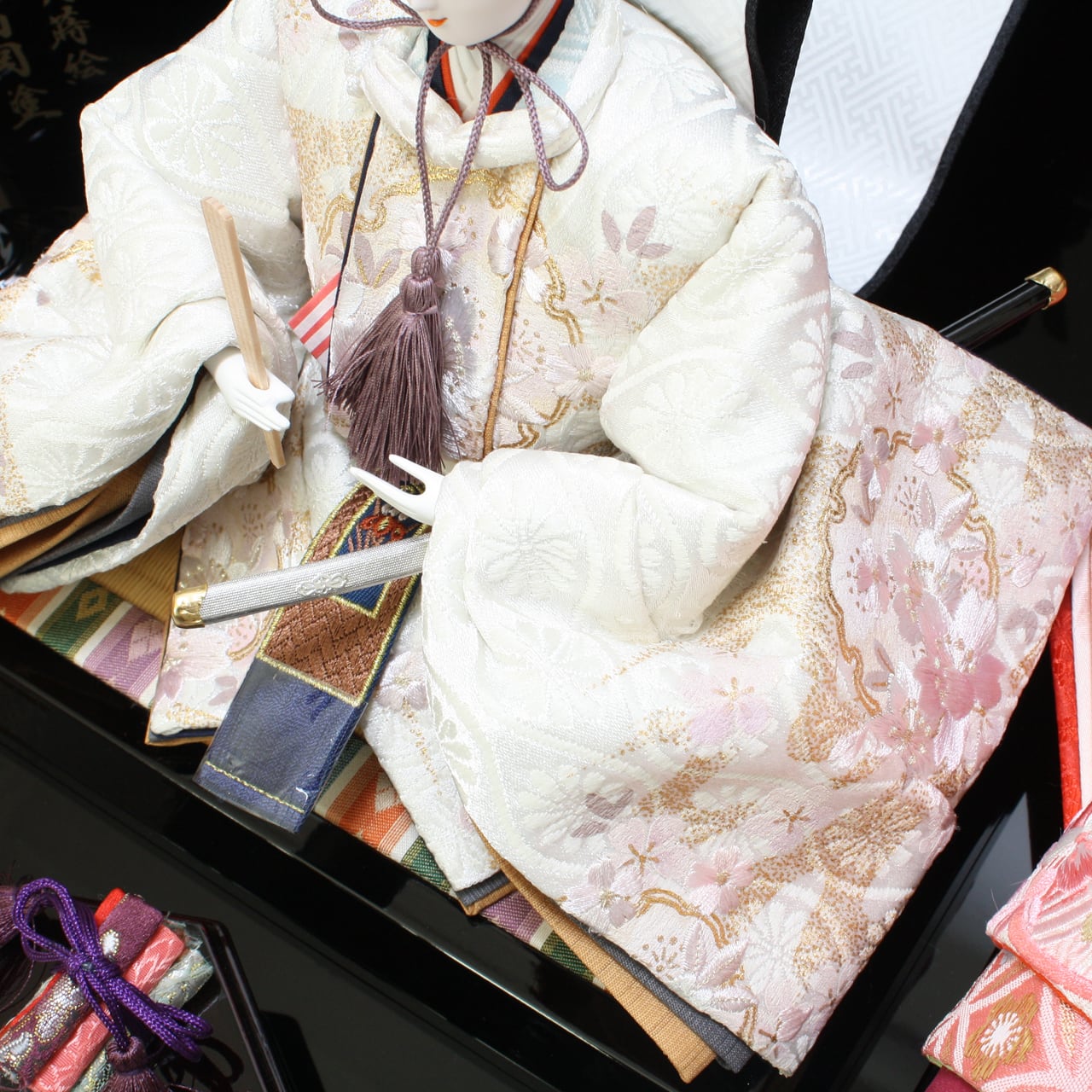 雛人形では、裳を後から着付けることで唐衣の背の裏地付け等を省いていますが、飛鳥雛は、本来の形式で唐衣全体を総裏作りし、裳の上から着付けることで、従来の雛にはない豪華さを演出しています。