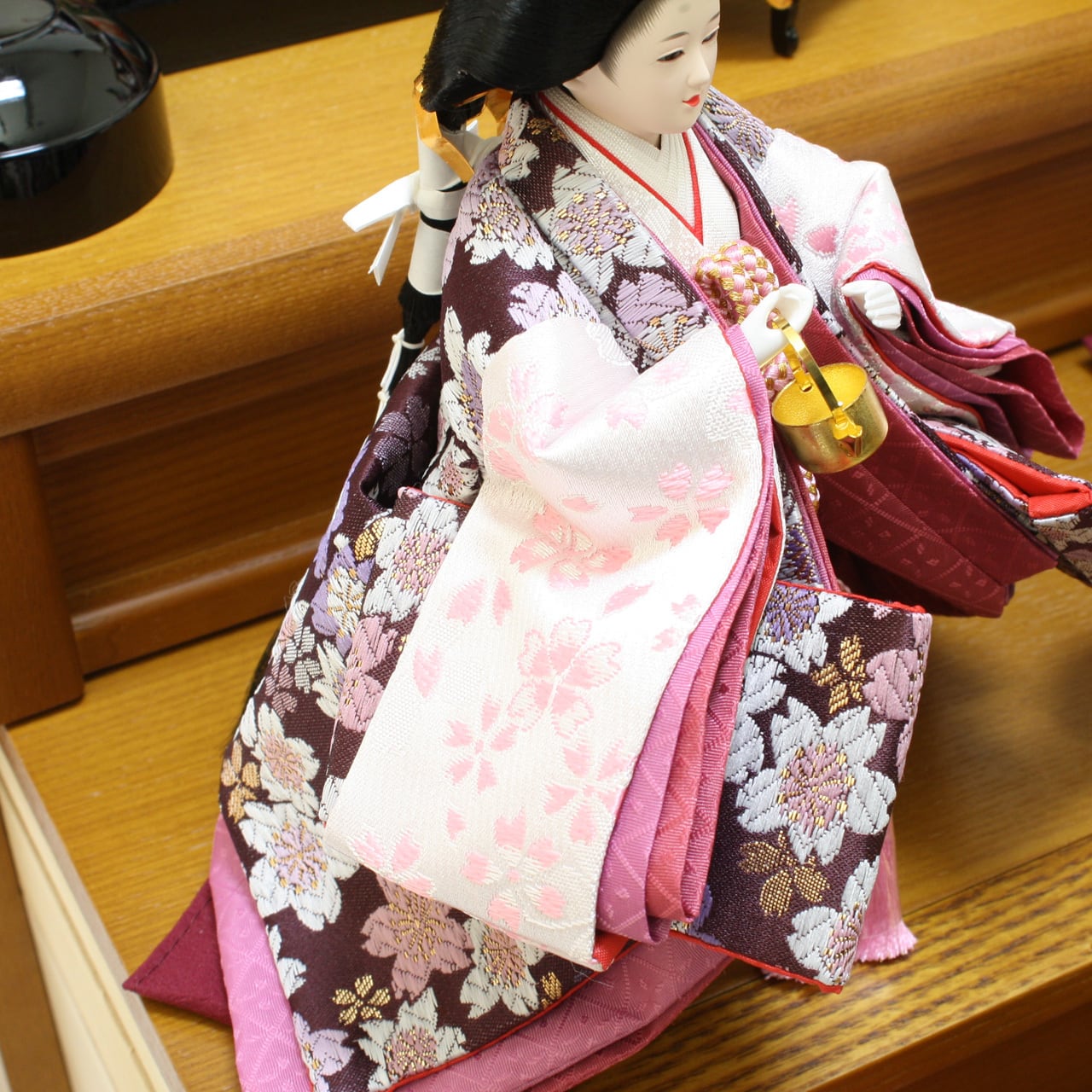 「親王飾り」に加え、「三人官女」や「御道具揃」などをお飾りしたのが、正統の美を凝縮した「五人飾り」です。便利な飾り台の中に収納できる引出収納タイプです。