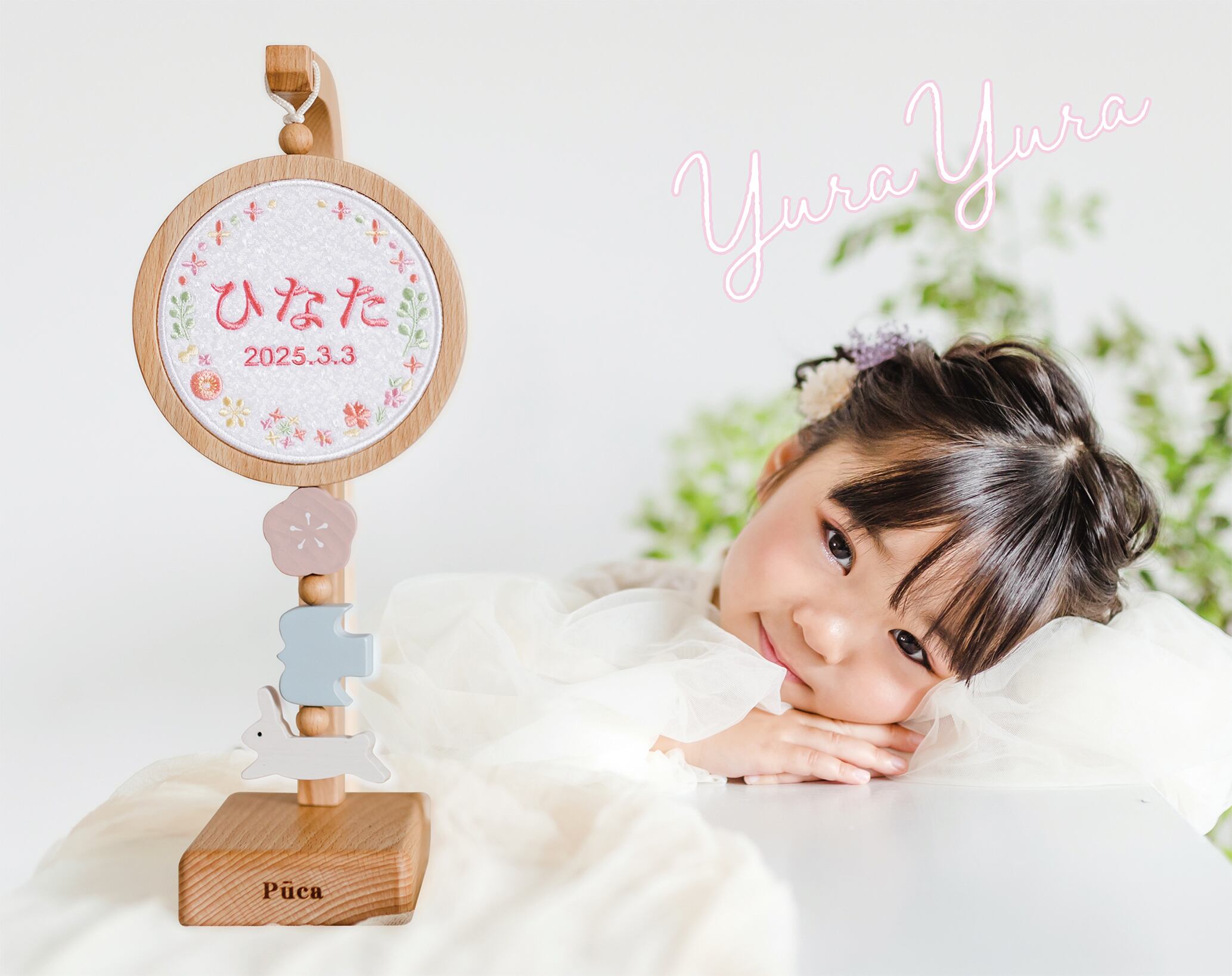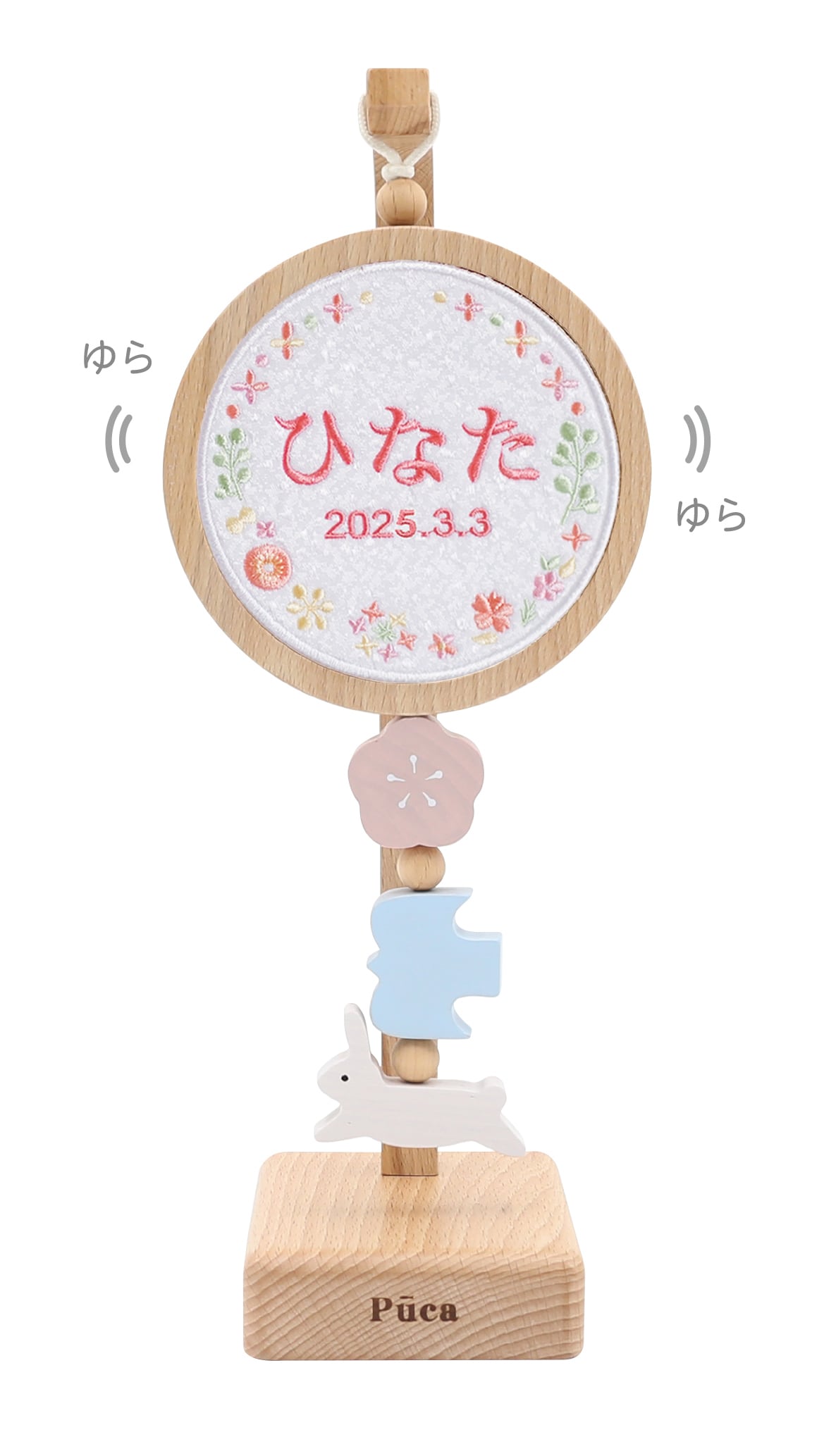 プーカの刺繍お名前飾り「くるくる」は、華やかなオリジナルの刺繍とくるくる回るコンパクトでかわいいデザインが魅力。大切なお子さまのお名前を刺繍で入れて、命名旗やひな人形・五月人形のお節句のお祝いにぴったりのアイテムです。